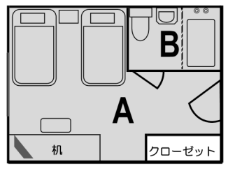 図は 、客室面積算定の例です。 通常は人が立ち入らないクローゼットを除いた網掛けの部分A(寝室)+B(浴室、洗面所、便所)が客室面積に算定されます。
