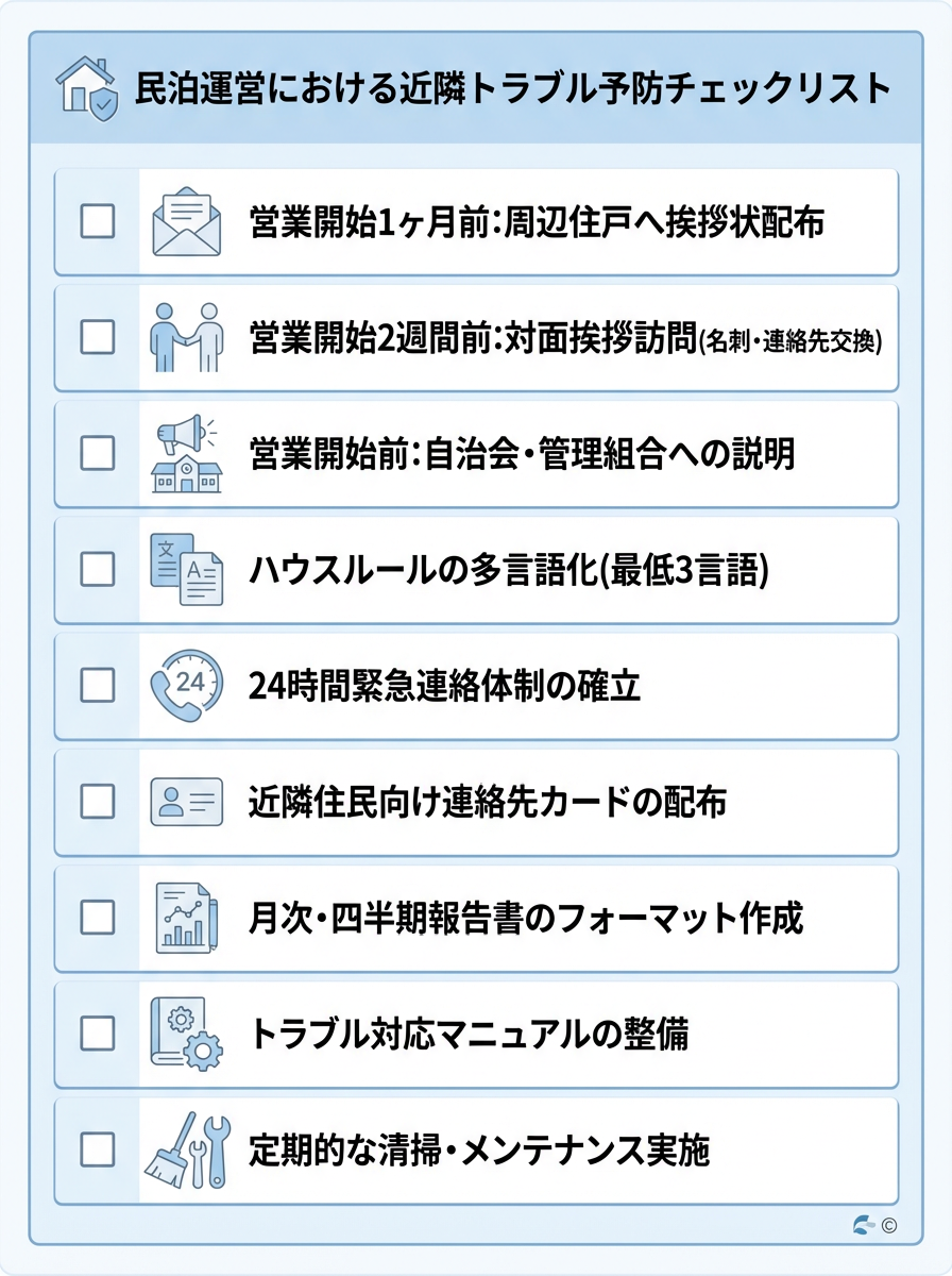 実は、民泊が営業停止に追い込まれるケースの多くは、近隣からの苦情が原因となっています。騒音、ゴミ出し、不審な人の出入り…一度関係が悪化すると、修復は困難です。